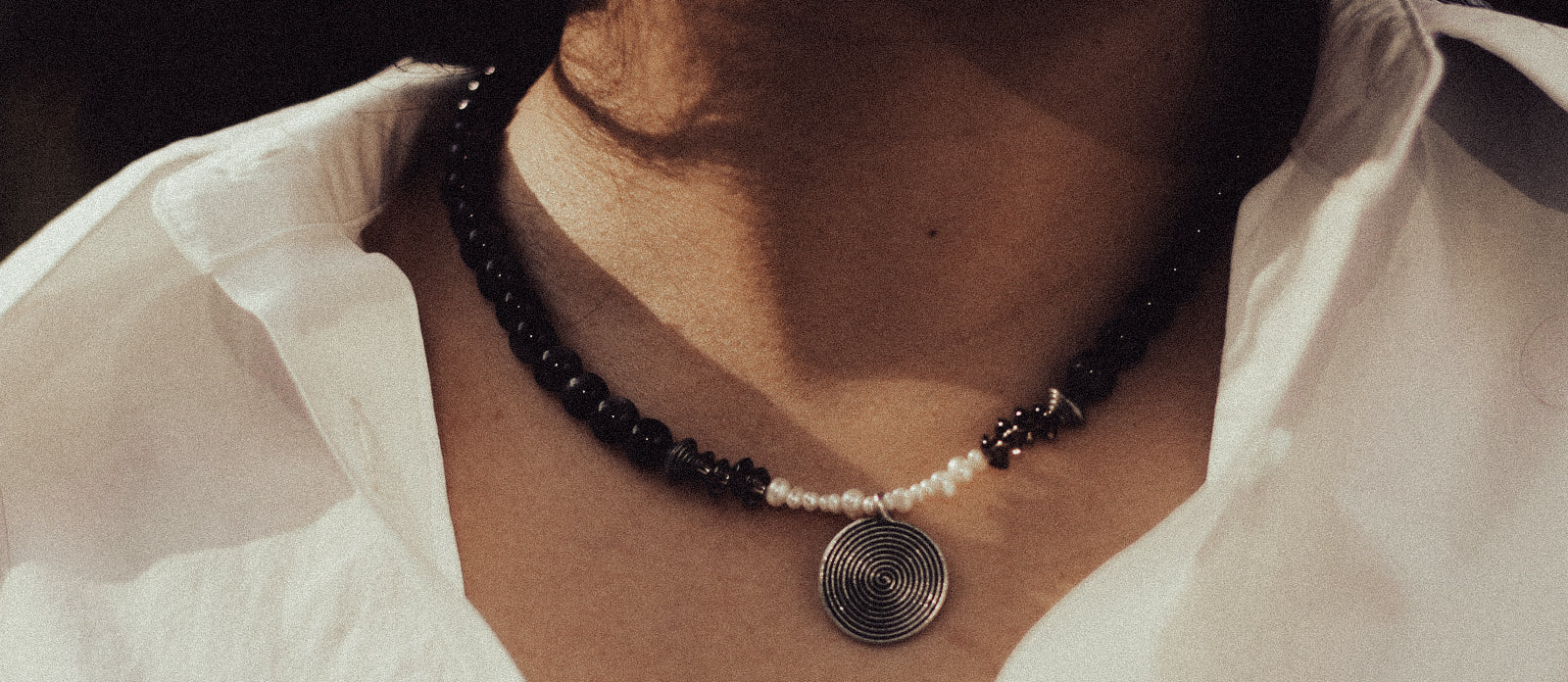Silver Sheen Obsidian and Smoky Quartz Necklace with Silver Spiral Pendant-st-0020